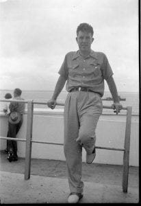 The “Grayson at Sea” photo depicts a slightly older and fuller-faced Leon. It is one of three snapshots in our possession of shipboard Leon in the same white suit and spotted tie. I wrote “July 1939” on one of them, and though I’d have to dig into how and why I came to that determination, the specificity of the month persuades the now-me to give the benefit of the doubt to the then-me. It is nevertheless possible the photos date to a later date, though likely not as late as Leon’s 1947 journey to and from Okinawa.