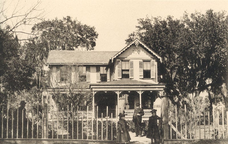 Shortly after the discovery of this old photo my Grayson cousin Monroe Parsons joined me for a family history tour in and around Savannah. We visited and prayed at the Bonaventure Cemetery gravesite, where William and Lillian are interred along with three of their children, two daughters-in-law, three grandchildren, and even two grand-dogs. It was a providential visit to the Wormsloe Historic Site, however, that ultimately helped solve the photo mystery. There we found a book that gave a short history of Isle of Hope, and of each of the homes along Bluff Drive.4 Beneath a contemporary photo of the four-columned former Grayson home was a ca. 1890 photo of the same house.
