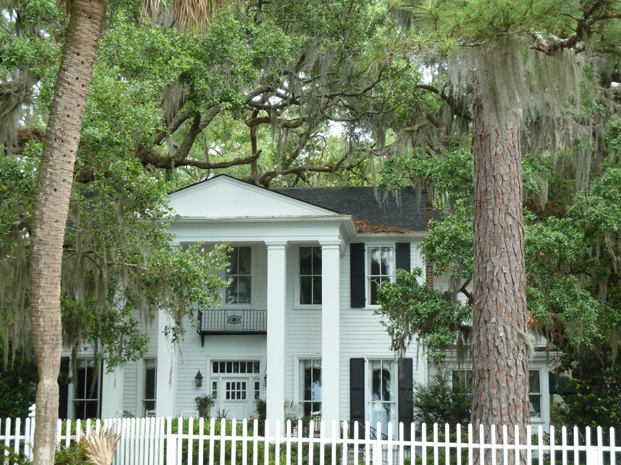After traversing its length we asked a few if they knew which was the former Grayson home. A friendly couple sitting on their veranda was able to confidently point us to #9 Bluff Drive, a neat two-story home with a grand four-columned facade, a century-old moss-laden oak shading its roof and yard. The dining room and parlor chandeliers within are said to have been crafted by Savannah artisan Juliette Gordon Low, later the founder of the Girl Scouts of America. A private dock on the Skidaway River lay across the Bluff Drive.